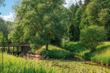 Beautiful Forest and river Landscape On A Summers Day. large tree on the bank of a forest river. Beautiful colorful summer spring natural landscape with lake or river in Park