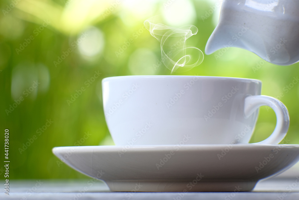 Coffee cup on table, coffee in the morning, space for text, hot cappuccino