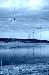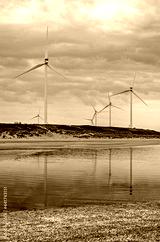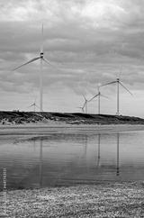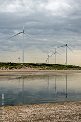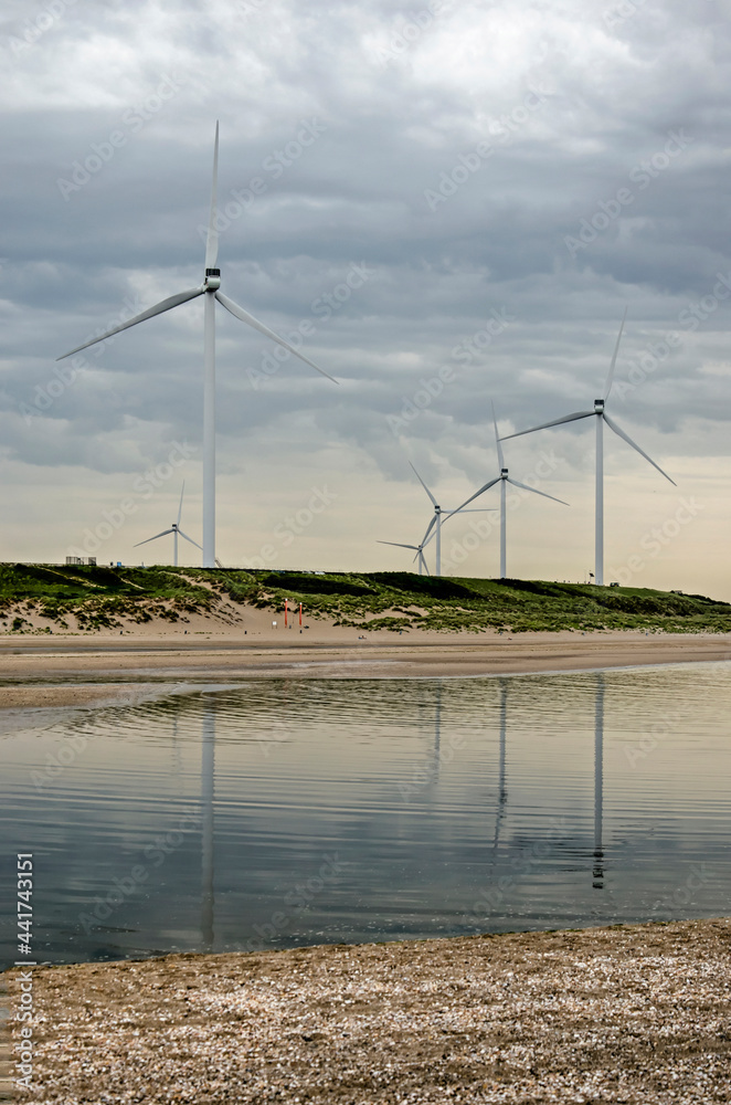 Large windturbines on Maasvlakte peninsula near Rotterdam, The Netherlands, reflecting in a shallow puddle on the beach under a dramatic sky