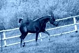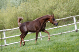 Beautiful arabian chestnut horse running on green summer background