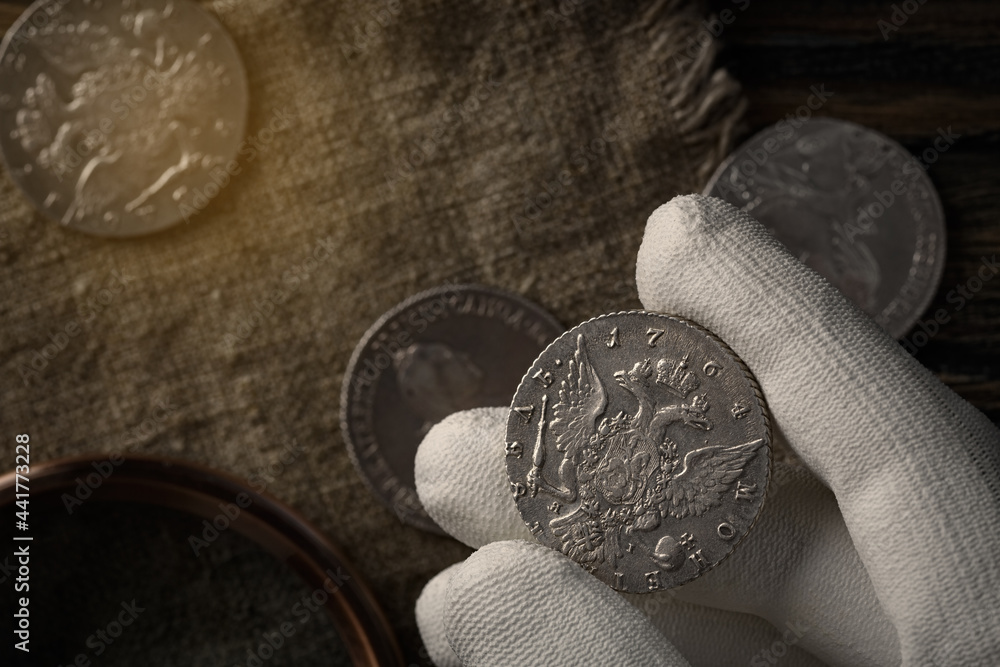 Numismatics. Old collectible coins of silver on the table.
