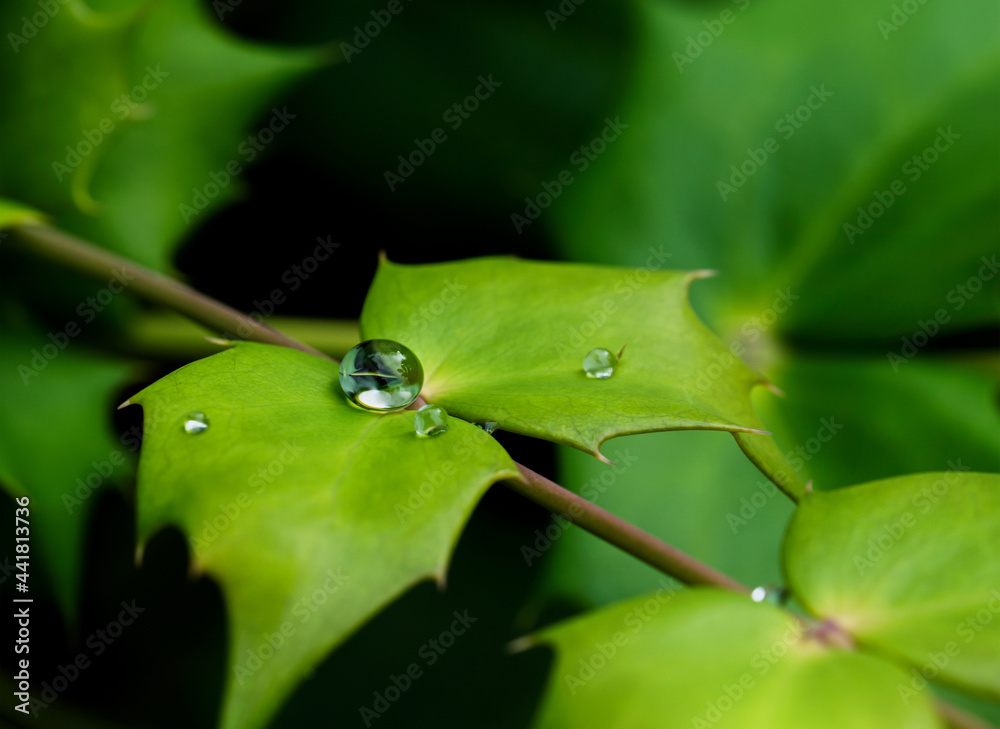 Macro rain drop on green leaf with sun shining in the morning. Drops of dew with transparent water on a green leaf, Beautiful Fresh natural background for eco friendly concept