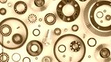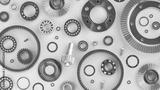 Flat layout of the flatlay of gears and bearings, with an empty space. Mechanical background of parts and mechanisms, 3d render.