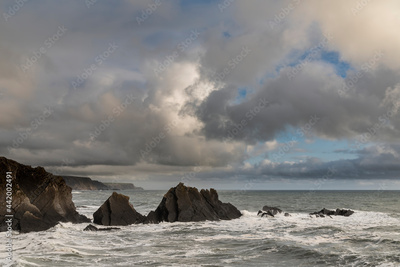 Stunning landscape image of view from Hartland Quay in Devon England durinbg moody Spring sunset