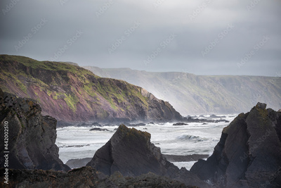 Stunning landscape image of view from Hartland Quay in Devon England durinbg moody Spring sunset