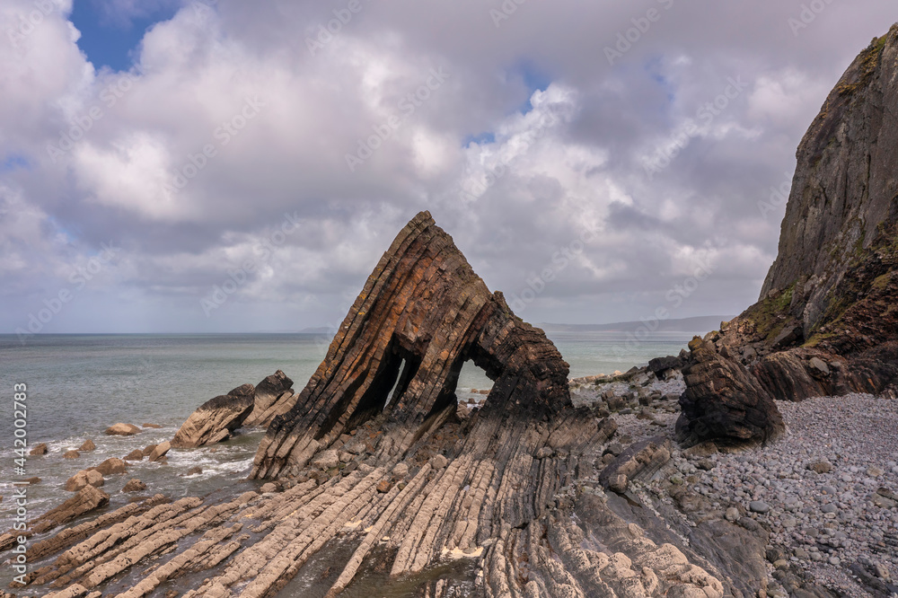 Stunning aerial drone flying landscape image of Blackchurch Rock on Devonian Geological formation