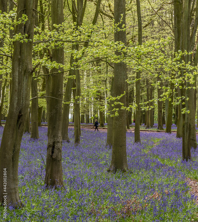 Lovely soft Spring light in bluebell woodland with vibrant colors and dense beech trees landscape