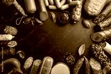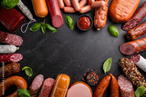 Set of different types of sausages, salami and smoked meat with basil and spices on a black stone background. Top view.