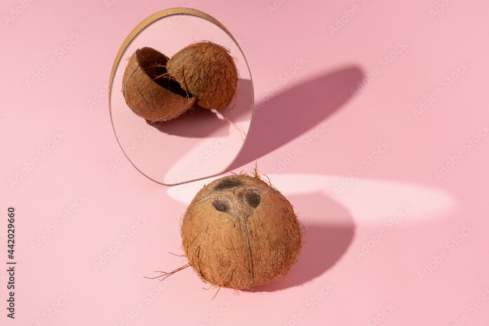 Coconut in a mirror with a broken reflection. Creative food or broken concept. Pink background