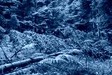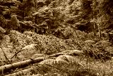 Widok na las zazieleniony wiosną. Drzewa iglaste i liściaste, ścieżki i przecinki, wycięte drzewo
