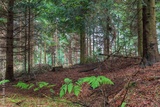 Widok na las zazieleniony wiosną. Drzewa iglaste i liściaste, ścieżki i przecinki, wycięte drzewo