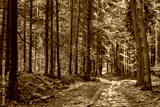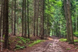 Widok na las zazieleniony wiosną. Drzewa iglaste i liściaste, ścieżki i przecinki, wycięte drzewo