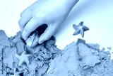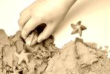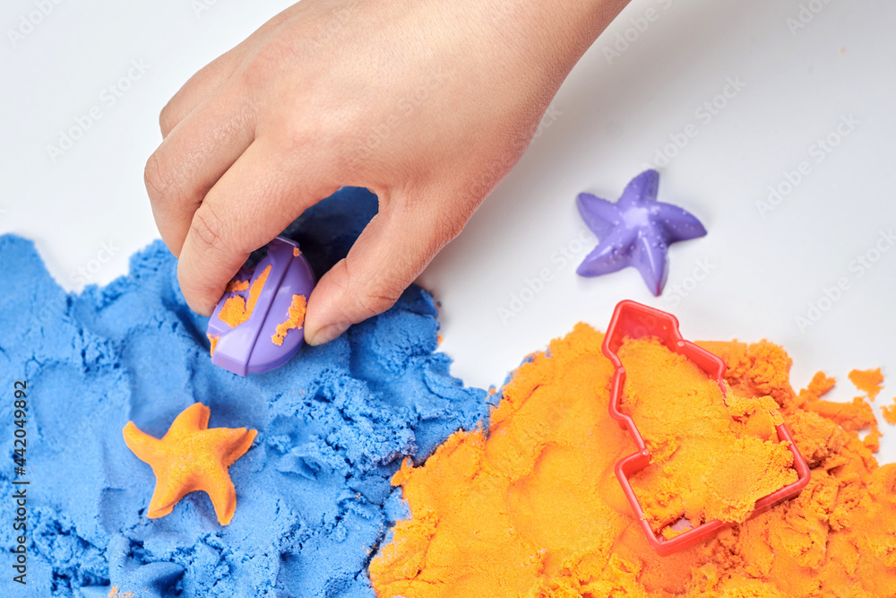 The girl's hand holds a sand beads filled with bright kinetic sand.