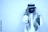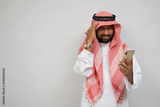 an arabian turban is dizzy while using a mobile phone with his hands holding his head on a plain background