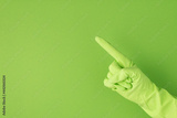 Photo of hand in green rubber glove making pointing symbol with forefinger on isolated green background with copyspace