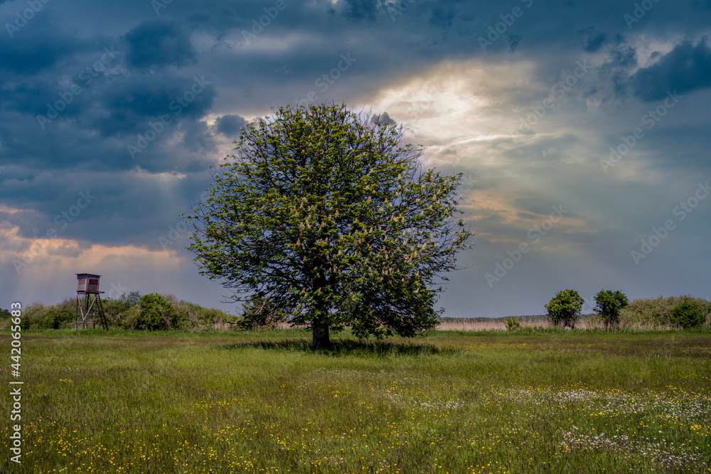 ein großer Baum auf einer Wiese vor bewölktem Himmel
