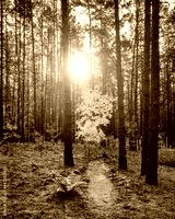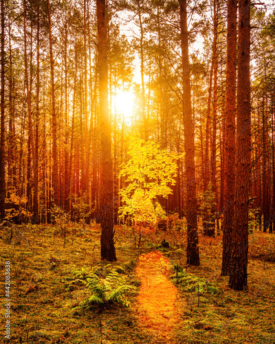 Maple with golden leaves in the autumn pine forest at sunset or sunrise. Sunbeams shining between trunks.
