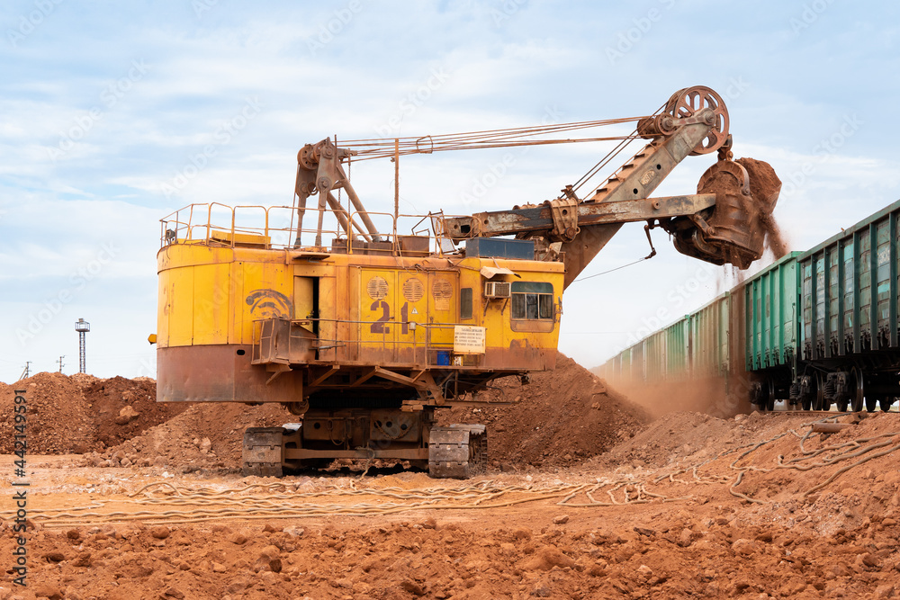 large excavator loads rock with iron or bauxite mining