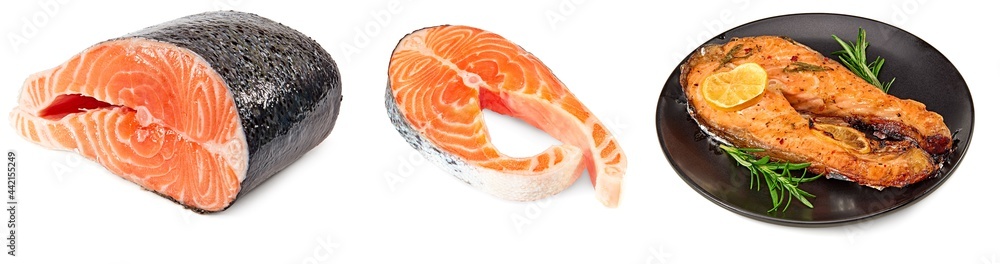slice of raw fish, salmon, trout, steak, isolated on white background, clipping path, full depth of field