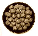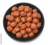 hazelnuts in black bowl isolated on white background macro. clipping path. top view