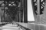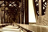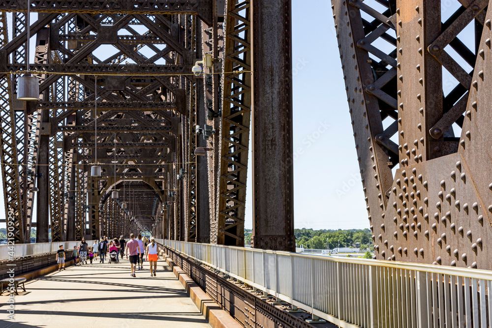 Close-up of the infrastructure of the pedestrian bridge from Louisville, Kentucky to Jeffersonville, Indiana over the Ohio River with people walking on the bridge.