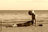 a young attractive woman, of Asian appearance, practicing yoga, performs a stretching exercise, on the beach. the cobra pose