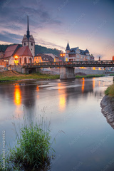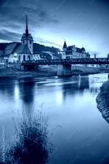 Gera, Germany. Cityscape image of old town Gera, Thuringia, Germany with St. Mary's Church and Untermhaus Bridge over White Elster River at sunset.