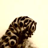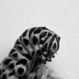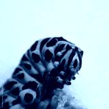 Caterpillar green with black and orange spots macro image, blurred background, very enlarged insect image
