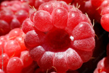 Industrial cultivation of raspberry plant. Ripe red fruits raspberry macro close up. Raspberry fruit background. Natural growing of berries on farm. Eco healthy organic food horticulture concept.
