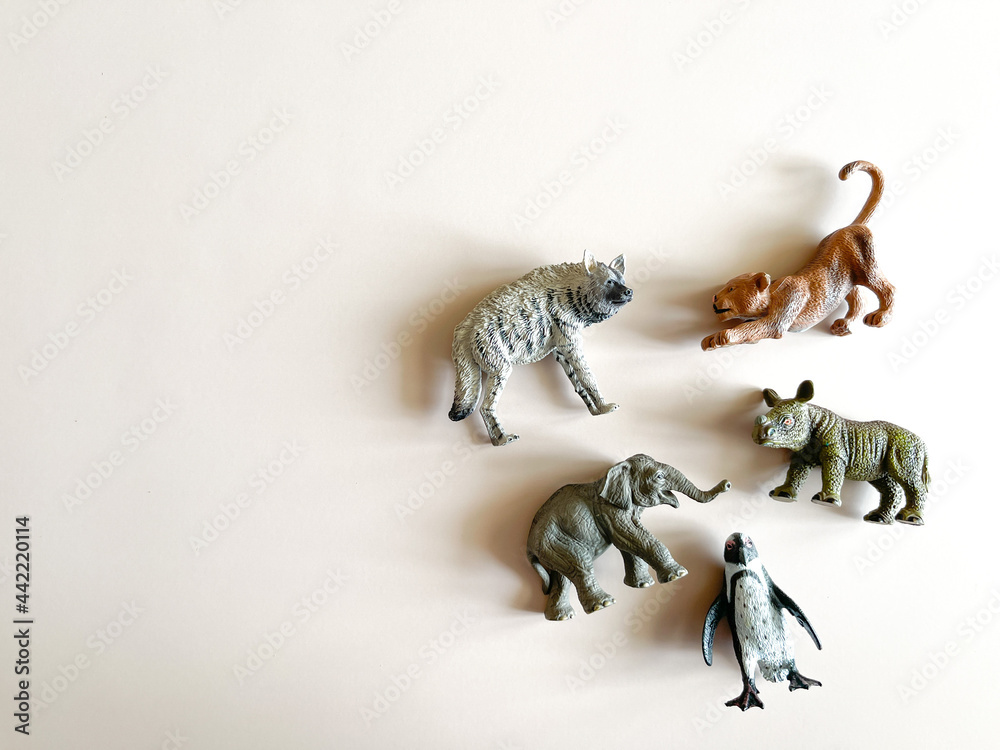 Figures of animals on a white background Children's toys: rhino, hippopotamus, zebra. The concept of children's play, montessori. many pieces to play. A gift for a child. Animal protection.