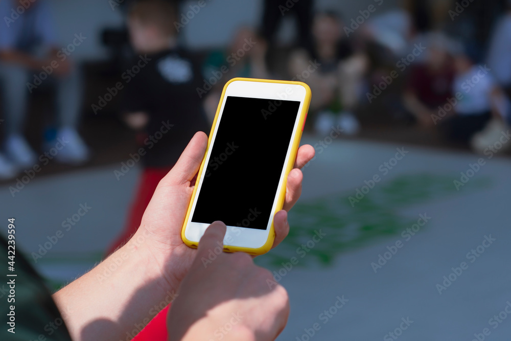 The guy holds a mock-up of a smartphone in his hand against the background of the children's dance championship.