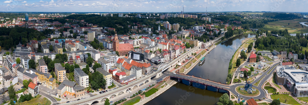 Panorama centrum miasta Gorzów Wielkopolski. W tle Most Staromiejki, CH Nova Park, wieża widokowa Dominanta, część zachodniego bulwaru i wschodni bulwar nad Wartą.