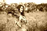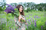 Beautiful girl with a bouquet of wild flowers. A girl in dress with a bouquet of lupine stands in flower field. Summertime. Blooming Lupine field. Summer vacation. Nature concept. space for text