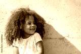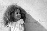 Outdoor portrait of a smiling girl. Curly african american girl is standing by a concrete wall.