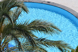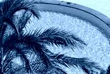 Close up of the palm tree leaves on the background of blue water of the pool.