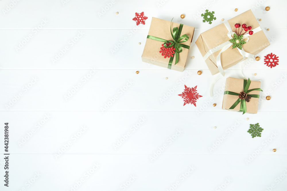 Three gift boxes wrapped in kraft paper decorated with red berries, white ribbons and Christmas greenery on white wood desk background Xmas, winter, holiday concept. Flat lay, top view, copy space