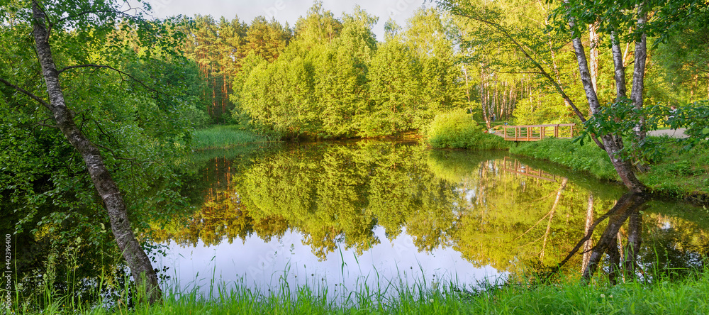 Moscow. June 19, 2021. Meshchersky Park. Beautiful forest with a pond in the evening.