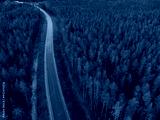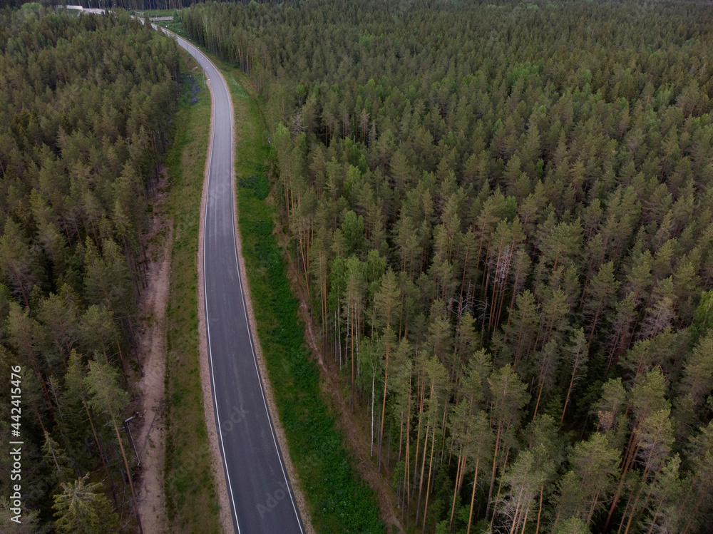 Asphalt road stretching far beyond the horizon between a green forest, top view