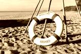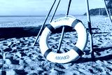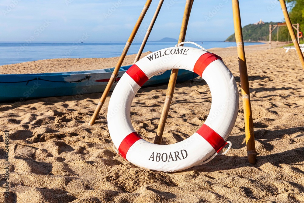 Lifebuoys for tourists are prepared on the beach in front of the resort hotel