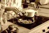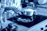 Woman cooking tasty rice with vegetables on stove in kitchen, closeup