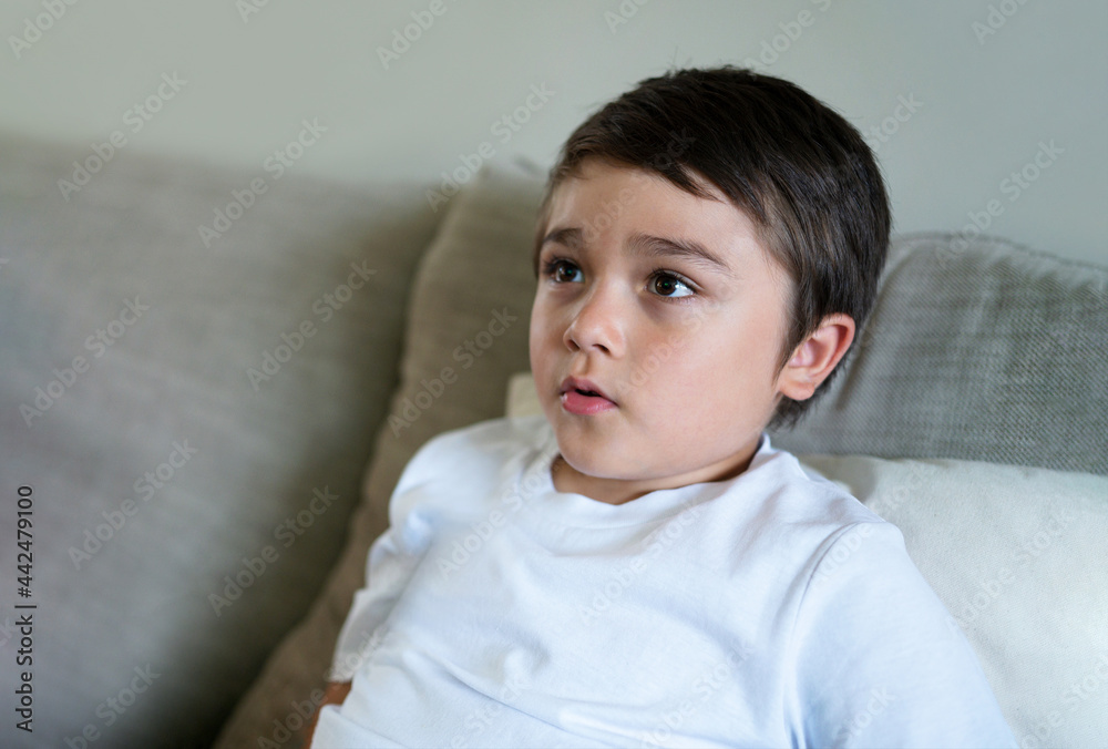 Authentic Kid sitting on sofa watching TV, Emotional portrait Young boy siting on sofa looking out with thinking face or nervous, Children Health care
