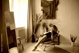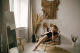 Young woman drinking tea or coffee in a cozy room with bohemian interior.