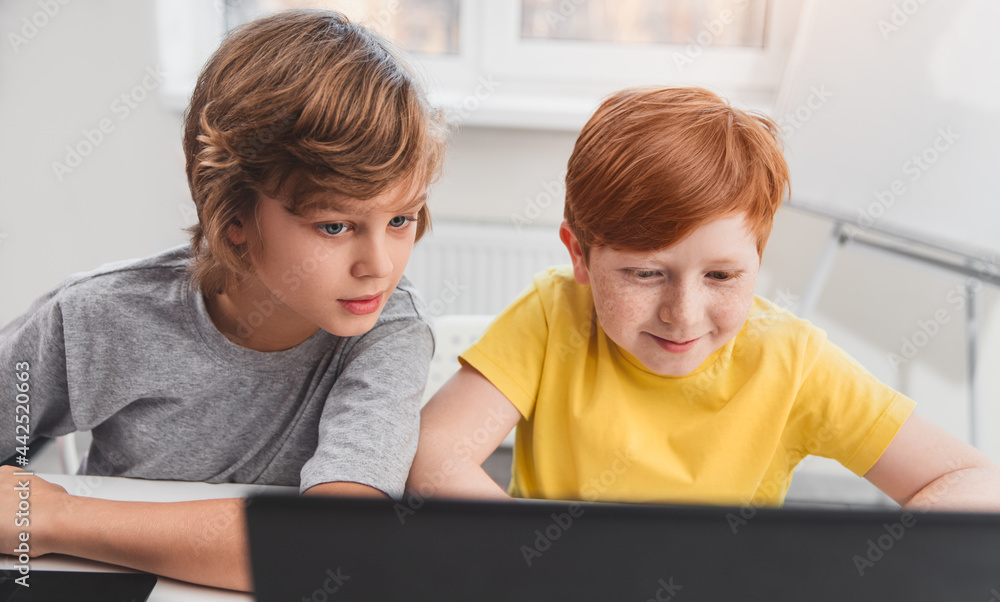 Happy kids studying computer science in classroom