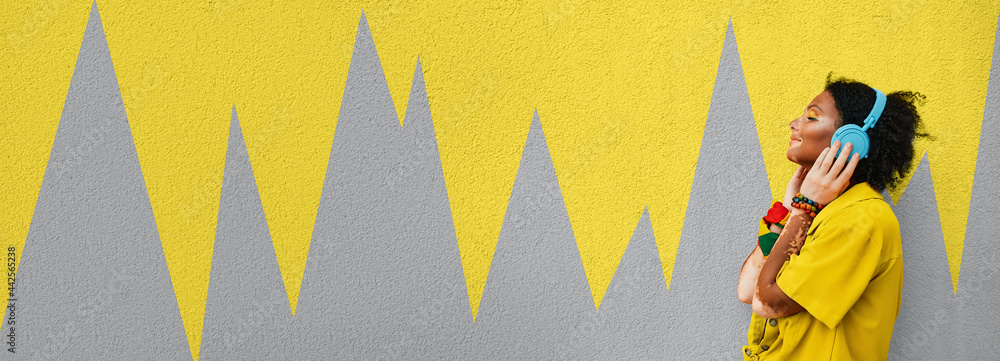 Woman music lover listens to music from her blue headphones near a urban wall painted in the colors of 2021 Ultimate Gray and Illuminating Yellow with a pattern of sound waves