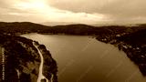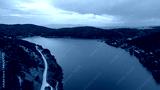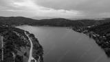 Aerial view the river on green forest plain. Amazing aerial shot of beautiful blue river. Forest background.