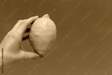 Woman holds a ripe lemon in her hand on blue sky background. Outdoor photo, close-up.