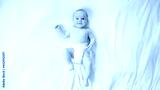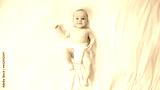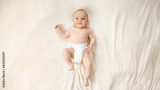 Top view of little baby boy in diapers lying on soft white blanket on bed.