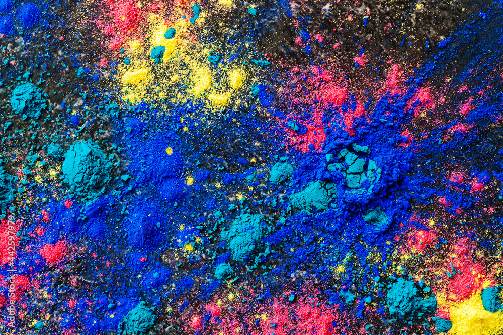 Top view abstract colorful Happy Holi background. Color vibrant powder on concrete. Colored splash explosion of dust texture. Flat lay holi dry paint decoration. Traditional indian hindi holiday.