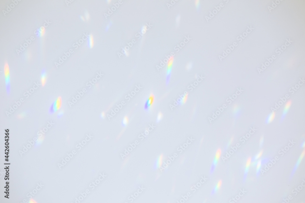 Blurred rainbow light refraction texture overlay effect for photo and mockups. Organic drop diagonal holographic flare on a white wall. Shadows for natural light effects
