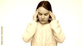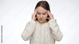 Studio portrait of young girl suffering from headache and rubbing temples.